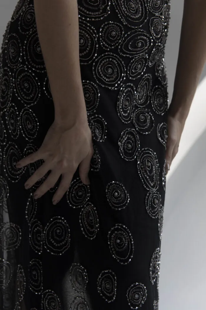 Aplique bordado de 20 cm elaborado con cristales facetados, piedras opales en tonos verde y celeste, strass y mostacillas. Su diseño ornamental aporta brillo y relieve, ideal para cinturones de novia, tocados o detalles en vestidos de alta costura.