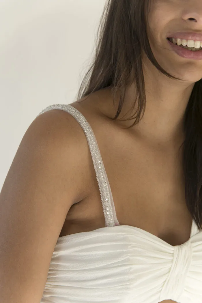 Su equilibrio entre textura y ligereza lo convierte en una opción ideal para acentos en vestidos, fajas o detalles románticos de novia.