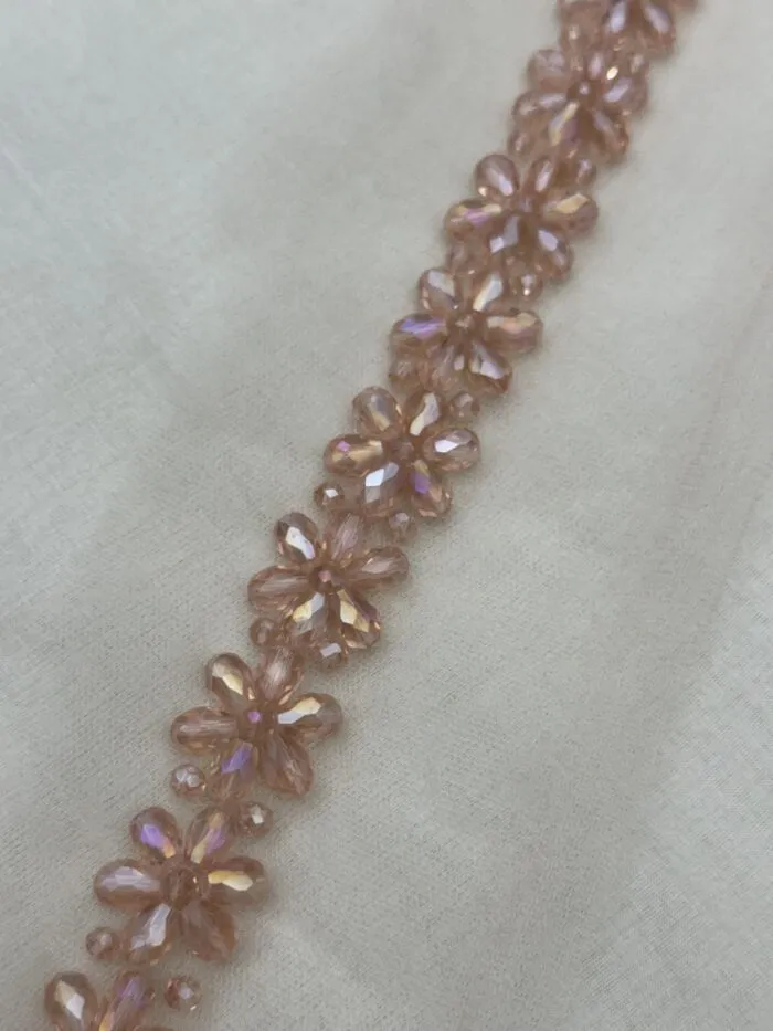 Cada flor combina pétalos moldeados con cuentas y mostacillas que forman ramificaciones y hojas, aportando textura, relieve y un acabado artesanal.