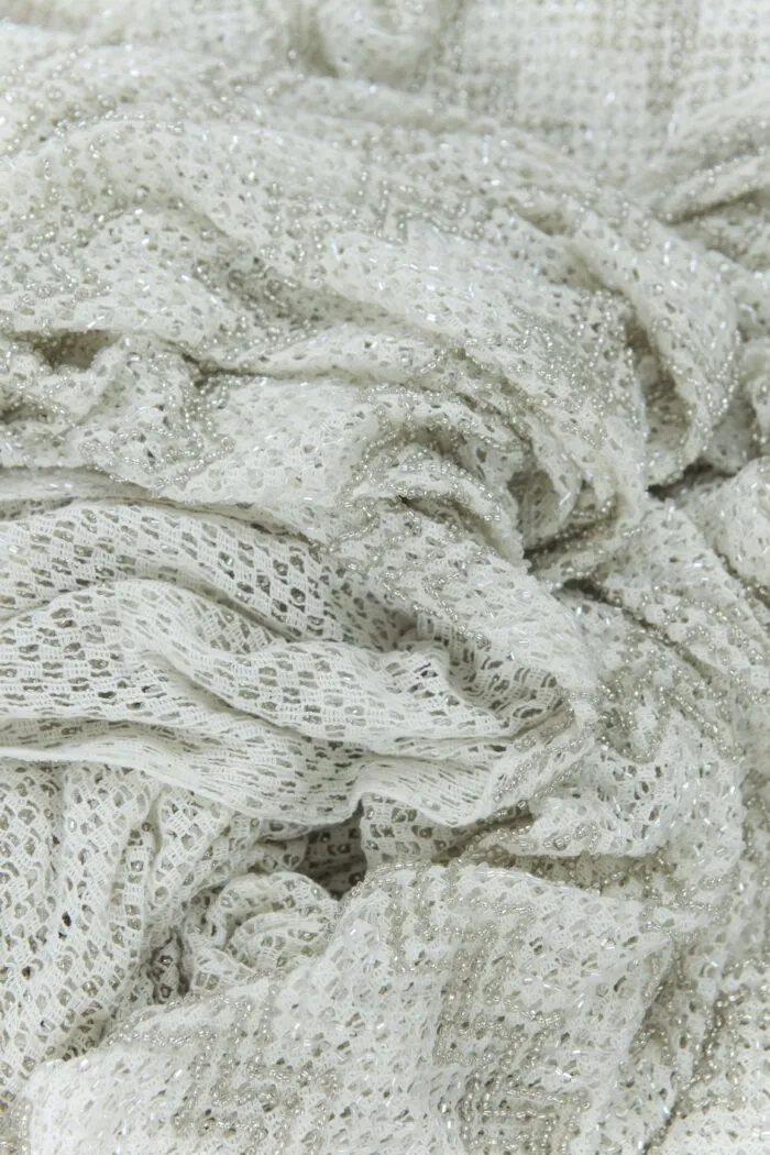 Red de algodón romboidal bordada a mano con perlas y canutillos, generando un falso liso de textura artesanal.
