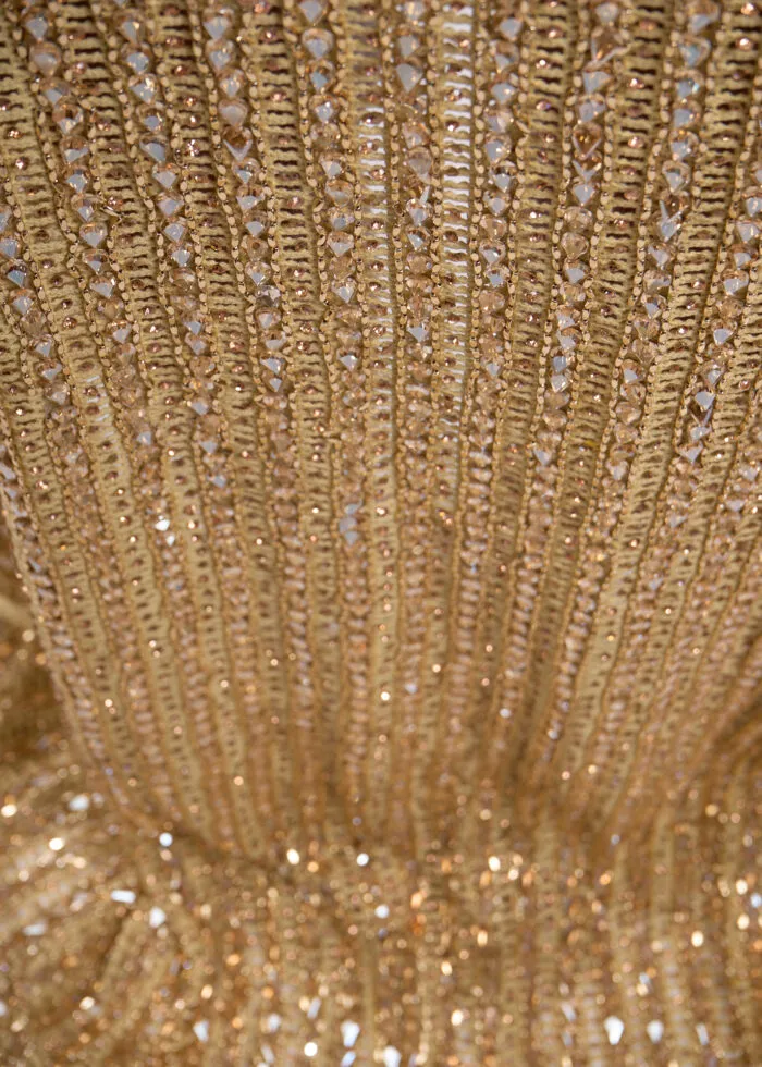 Red de algodón tipo macramé en tono off white, bordada de manera uniforme con strass cristal que conforman un dibujo geométrico de eslabones entrelazados.