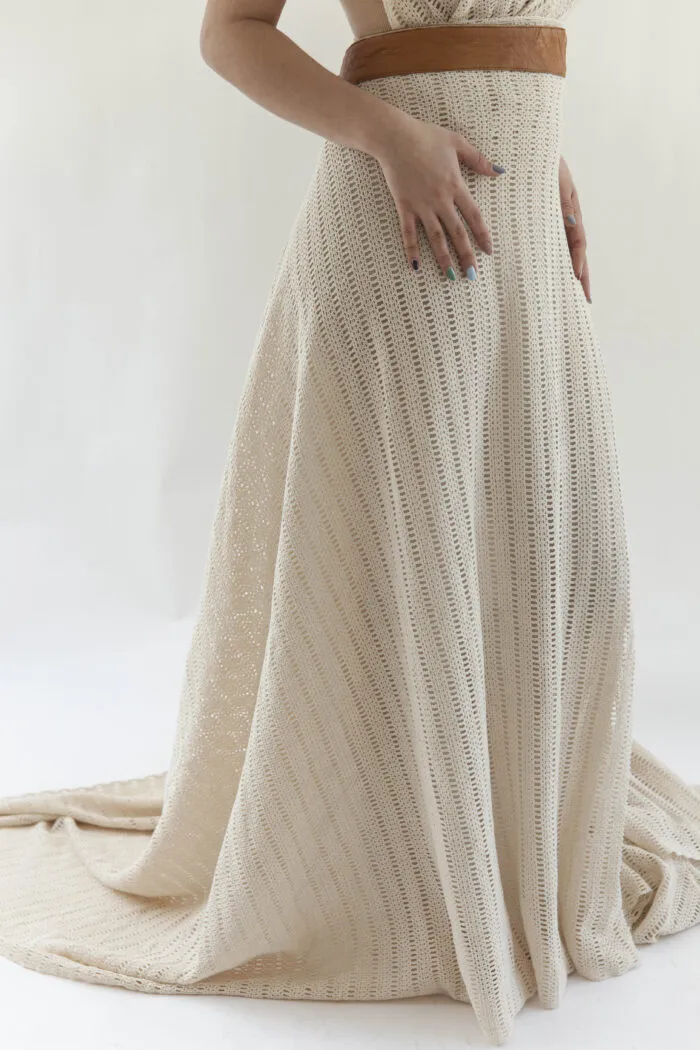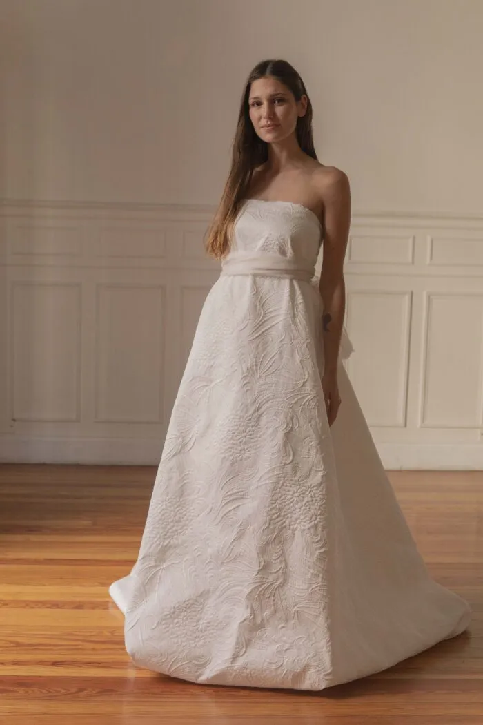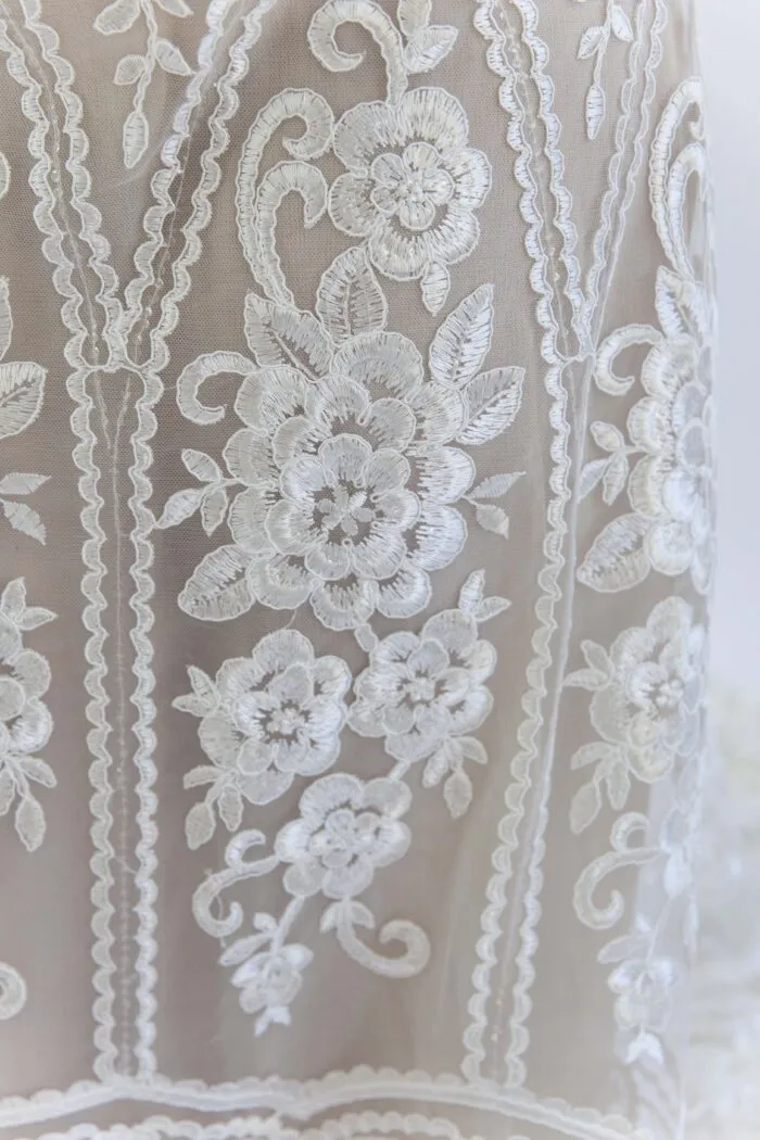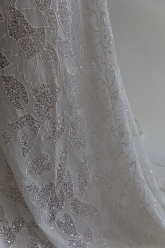 El bordado combina materiales translúcidos y metálicos al tono, generando un efecto lineal de brillo y movimiento.