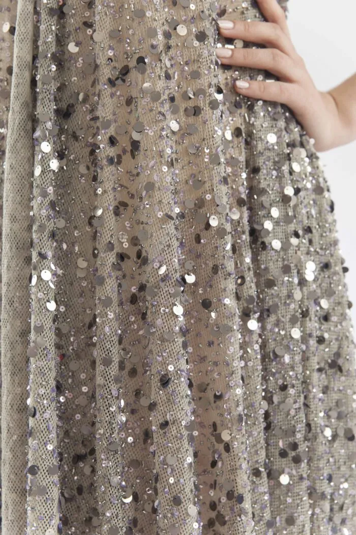 El bordado combina hilo, mostacillas, canutiloos y lentejuelas al tono, generando un relieve texturado con acabado satinado.