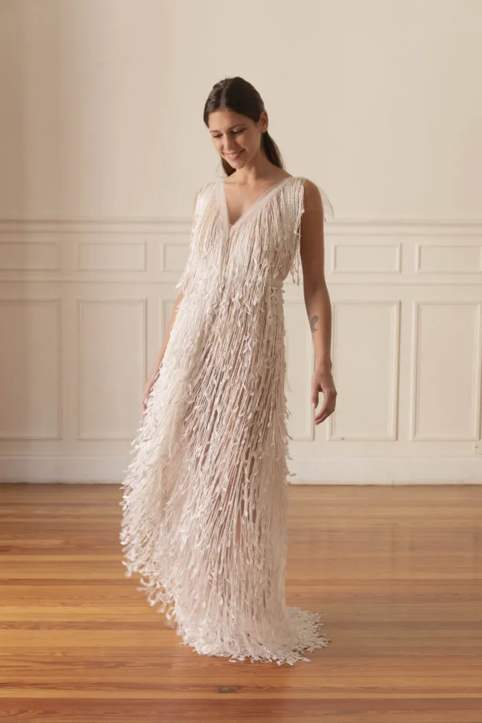 Encaje con diseño floral delicado y entramado fino que aporta transparencia y ligereza. Los motivos se desarrollan de forma orgánica a lo largo de la superficie, acompañados por bordes definidos que enmarcan la tela y permiten jugar con terminaciones sin necesidad de recortes adicionales. Su estructura liviana y suave caída lo convierten en una opción ideal para piezas etéreas y femeninas, manteniendo un alto nivel de sofisticación. Perfecto para vestidos de novia, capas, mangas y sobrevestidos.