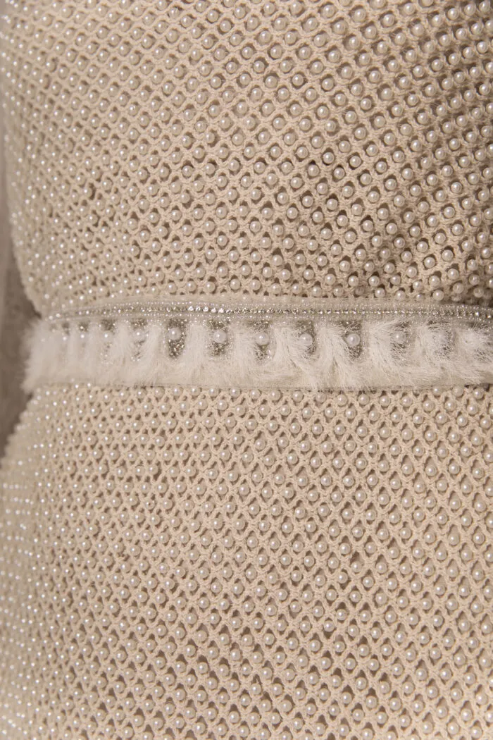 Galón bordado sobre base de tul con flores tridimensionales formadas por piedras acrílicas facetadas en tono nude y lentejuelas color champagne.