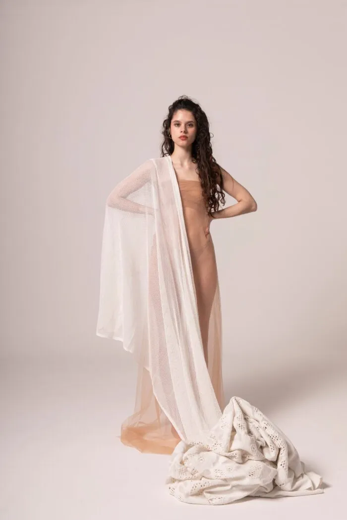 Guipure con diseño floral de gran escala y trama calada que genera transparencias delicadas. Un textil con relieve y estructura, ideal para vestidos de novia y piezas de alta costura.