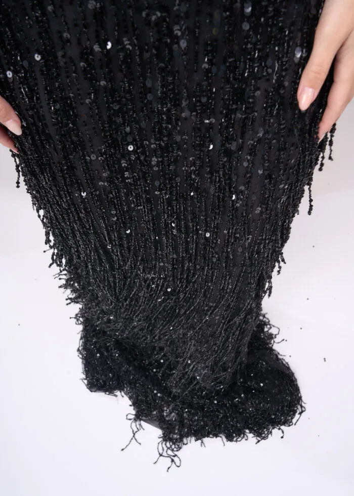 El diseño orgánico de líneas ascendentes combina bordado plano y en relieve, generando una textura tridimensional con movimiento y profundidad.