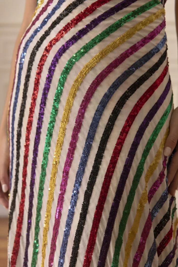 El diseño orgánico de líneas ascendentes combina bordado plano y en relieve, generando una textura tridimensional que aporta movimiento y profundidad.
